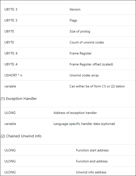 .pdata 섹션은 아래와 같이 RUNTIME_FUNCTION 구조체 배열로 구성되어 있는데, RUNTIME_FUNCTION 멤버인 BeginAddress와 EndAddress 사이에서 예외가 발생하면 UnwindInfoAddress 구조체를 참조하여 해당 영역의 예외처리 함수를 호출한다.
