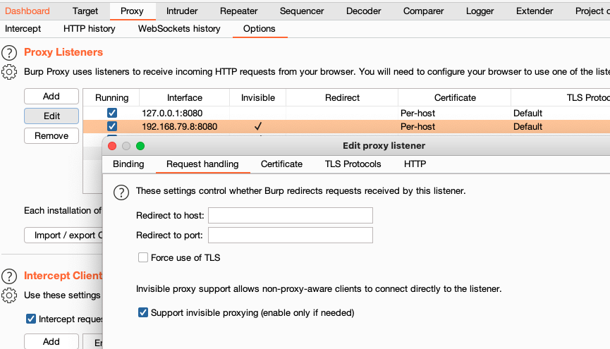 이때 버프슈트를 이용할 경우 "Support invisible porxying" 기능을 ON 해야하는데 이 옵션은 "Proxy > Options > Proxy Liseners > Edit or Add > Request handling" 에서 찾을 수 있다.