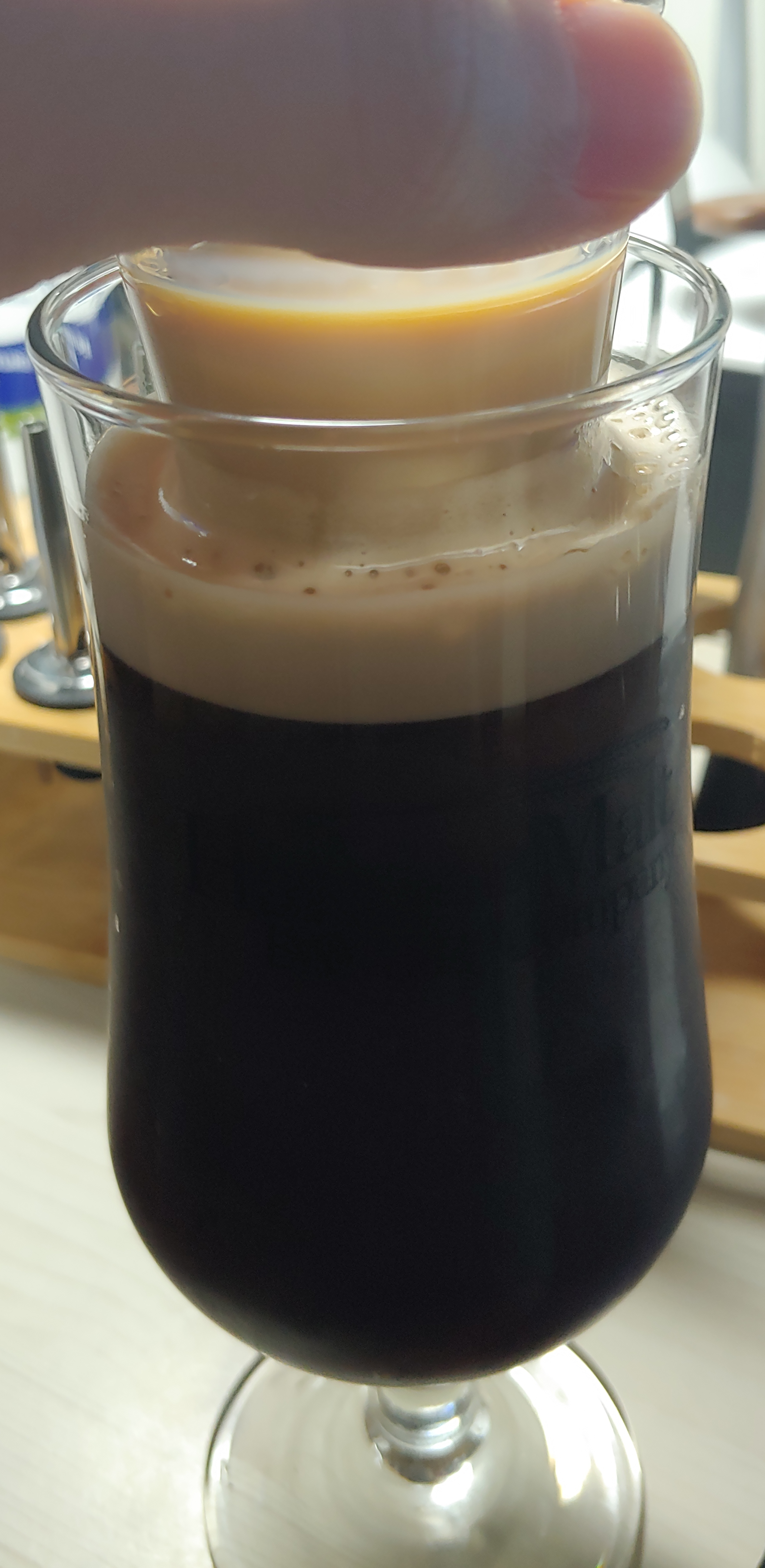 2. 기네스 맥주잔 2/3, 제임슨 위스키 1/2샷, 베일리스 1/2샷